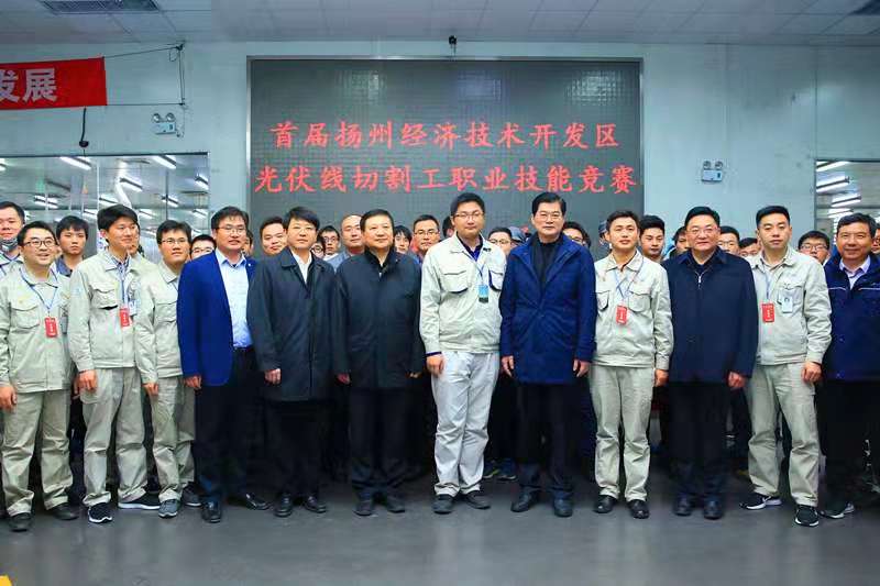 12月6日上午10點,正值揚州經濟技術開發區首屆硅片線切割工職業技能競賽正在揚州協鑫光伏科技有限公司切片車間如火如荼進行期間,江蘇省人大常委會副主任、省總工會主席魏國強等一行領導蒞臨開發區考察調研,并親臨實操比賽現場,為所有參賽選手鼓勁。