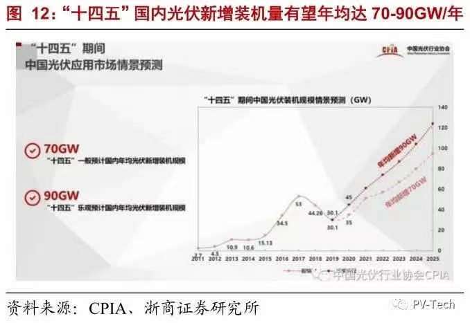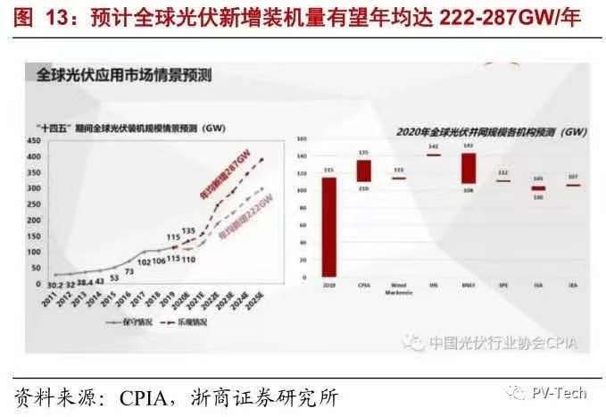 1) CPIA對(duì)光伏行業(yè)“十四五”期間進(jìn)行展望,預(yù)計(jì)在2019-2025年期間,可再生能源將滿(mǎn)足99%的全球電力增量。到2025年,可再生能源在新增發(fā)電裝機(jī)中占比將達(dá)到95%,其中光伏將在所以可再生能源的新增裝機(jī)量占比中達(dá)到60%。