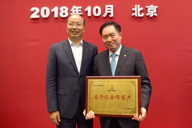 工商銀行董事長易會滿向協(xié)鑫集團董事長朱共山頒發(fā)“中國工商銀行總行級合作客戶”牌匾并合影留念。