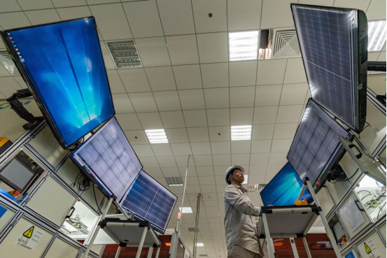 安徽省合肥市肥東縣合肥循環經濟示范園內的協鑫集成高效光伏組件生產車間,工人正在電腦前對生產線上光伏板進行質檢。