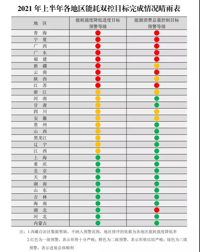 為貫徹落實黨中央、國務院關于強化能耗雙控的決策部署,加強能耗雙控形勢分析預警,根據上半年各地能源消費情況,我們制定了《2021年上半年各地區能耗雙控目標完成情況晴雨表》,現印發給你們。